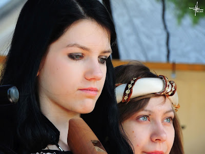 W sobotni wieczór w mojej drużynie było zaplanowane ważne wydarzenie dla dwójki nowicjuszy, którzy mieli stać się pełnoprawnymi członkami Ulfhirdu. Po południu można było w naszym obozie podpatrzeć skromne przygotowania do tej uroczystości - dziewczyny zaplatały fikuśnie włosy, a Feima zaryzykowała nałożenie naturalnego czernidła na powieki. Wcześniej w ciągu dnia taka próba przy 30 stopniowym upale zakończyła się spłynięciem całości po minucie do oczu :) Cenne obserwacje na przyszłość względem kosmetyków: więcej wosku niż smalcu, za to patyczek sprawdza się świetnie w roli pędzelka do powiek/ eyelinera. - Żywia