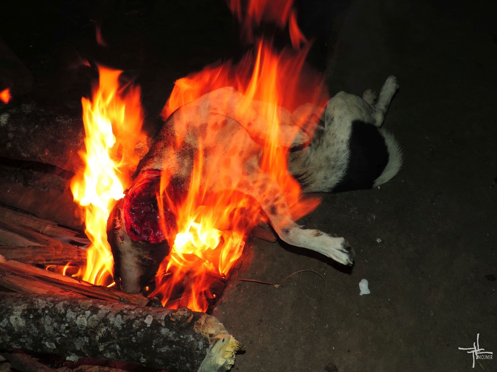 Na początku nie bardzo mogłem zlokalizować skąd dochodzi bębnienie ze względu na jego przerywany charakter. W końcu zbliżyłem się do właściwej lokalizacji, bębny znowu zagrały nie dalej niż 100 metrów ode mnie, a ja prawie się po drodze wpakowałem w ognisko, kiedy na nie spojrzałem to mnie trochę zatkało. Oto w ogniu leżał sobie jakiś martwy piesek z gardłem rozpłatanym maczetą i powoli pozbywał się sierści. Takich rzeczy nie widuje się codziennie. Jako jednostka z jednej strony kulturalna, a z drugiej nie mająca żadnej ochoty do psa dołączyć, grzecznie zapytałem co się dzieje i czy mogę sfotografować. Miejscowi zajmujący się właśnie przygotowywaniem tej dość osobliwej kolacji nie mieli nic przeciwko, a nawet grzecznie i chętnie wyjaśnili, że dzisiaj są urodziny w wiosce, facet kończy 35 lat i z tej okazji będzie gulasz z burka. To jeszcze grzecznie zapytałem (maczeta w ręku mojego rozmówcy zawsze sprawia, że jestem przynajmniej o ton bardziej uprzejmy) czy mogę żonę przyprowadzić, bo też by chciała zobaczyć, dostałem odpowiedź twierdzącą i biegiem puściłem się po Żywię. Jakoś tak pomyślałem, że będzie zainteresowana. Trochę się zdziwiła kiedy wpadłem do mieszkania i kazałem jej się zbierać, wystarczyło kilka słów wyjaśnienia, żeby ponaglenia stały się zbędne. Może po 10 minutach byliśmy już przy ognisku. Okazało się, że głównym oprawiającym jest pan sprzedawca, z którym jeszcze niedawno spożywaliśmy arak jego produkcji, jaka ta Indonezja mała... Może dlatego bez żadnych oporów pozwolono nam zostać i obserwować? Mniejsza z tym, ważne, że zaproszono nas do towarzystwa i zapewniono iż nie przeszkadzamy. W tym czasie piesek przybrał już brunatną barwę i został kilka razy w ognisku obrócony. Gdy opalił się dostatecznie mocno został wyciągnięty z ogniska i dokładnie oskrobany maczetą z resztek futra.